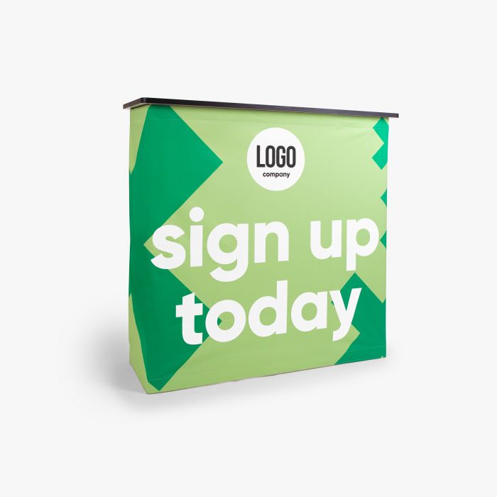 Op zoek naar een voordelige maar professionele manier om jouw merk zichtbaar te maken op evenementen of beurzen? De Pop‑Up Counter is ideaal als mobiele balie voor je beursstand of promotiekraam. Dankzij het lichte frame met geprint doek oogt je presentatie strak en professioneel. Je hebt de keuze uit materialen zoals geprint Dekostof of Blackback Soft‑doek op het frame. Het frame wordt geleverd inclusief zwart topblad, legplank en transporttas, en is ontworpen voor snelle opbouw zonder gereedschap.